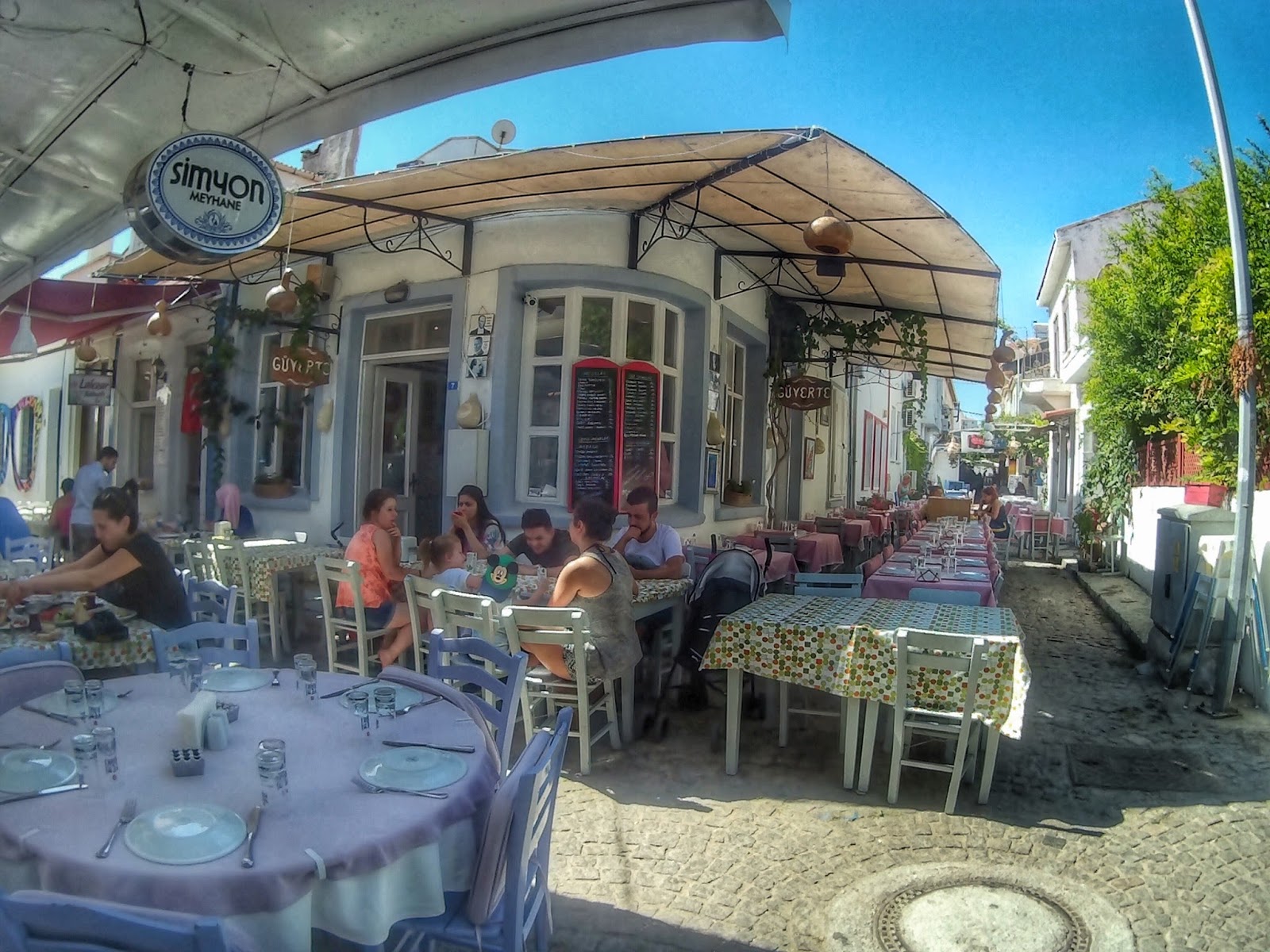 Polente: Mavi beyaz ada ile bütünleşmiş takılmalık sokak mekanı.
